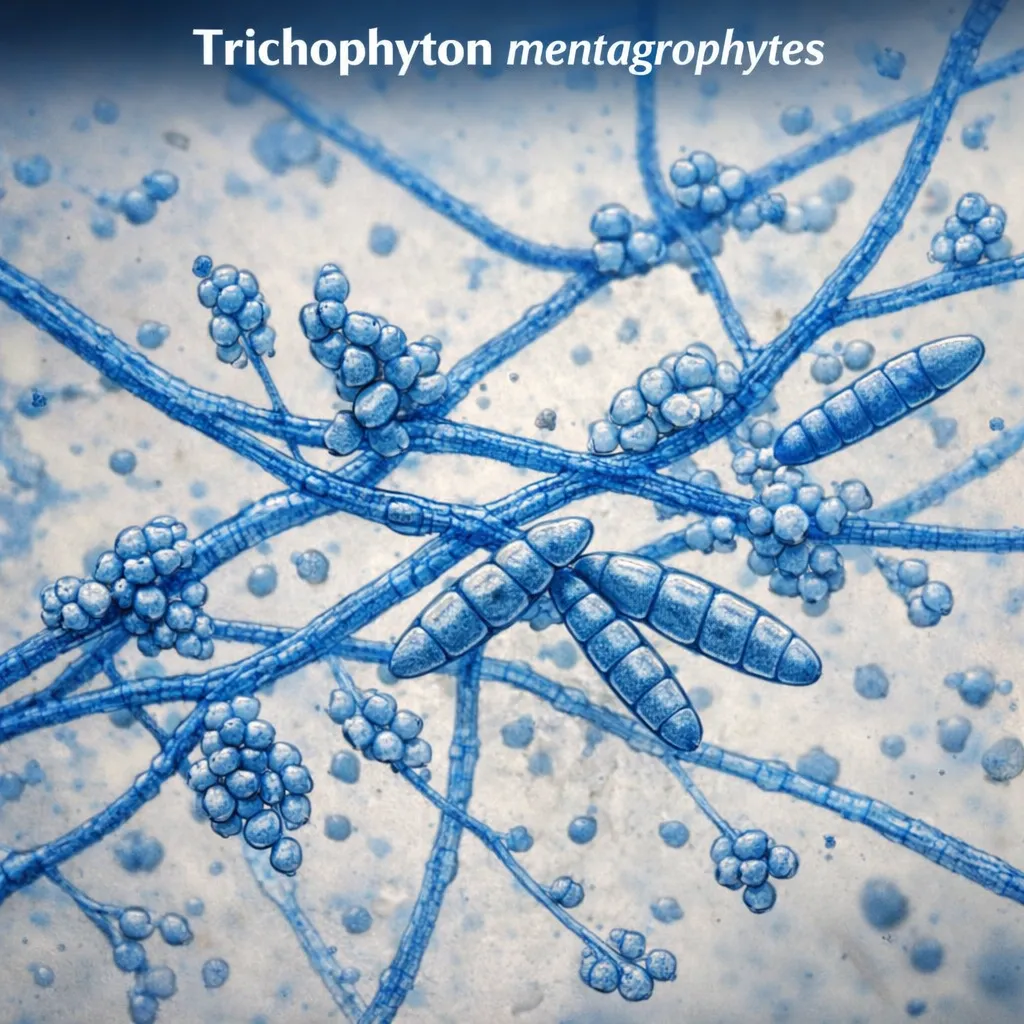 トリコフィトン・メンタグロフィテスは、皮膚の角質部分に付着し、角質中のケラチンを栄養源として増殖します。成長すると糸状の菌糸を伸ばし、皮膚表面から爪、毛髪にまで侵入することができます。この菌が放つ胞子は非常に小さく、肉眼では見えないにも関わらず長時間空中に浮遊することもあり、呼吸器にまで影響を及ぼす可能性があるとされています。