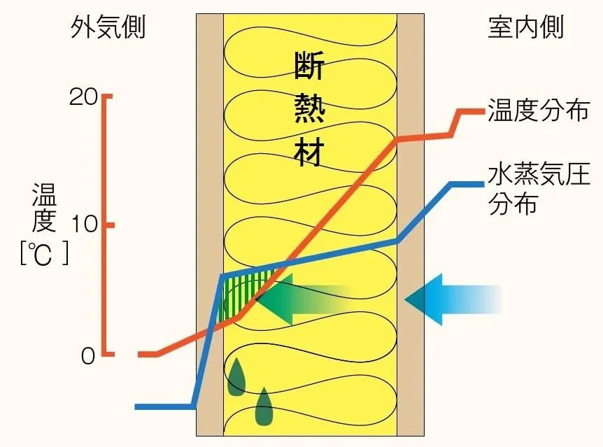 次に、室内ではエアコンが稼働しています。特に近年は24時間冷房が一般的になっており、室内の壁(石膏ボード)や断熱材は常に冷やされている状態になります。すると、壁の中に「冷たい層」ができるのです。
